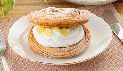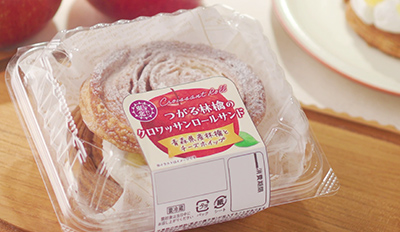 - 青森県産つがる林檎のダイスをのせたチーズホイップをクロワッサンロールでサンドしました。林檎とチーズホイップがマッチした爽やかな味わいです。